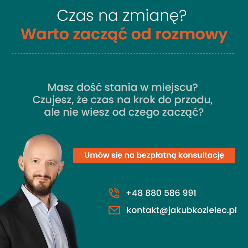 Opublikowano na Marta Foryś-ŻurekTrustindex sprawdza, czy pierwotnym źródłem recenzji jest Google. Super przewodnik na drodze do zmiany! Spokojny, ostrożny, nieoceniający. Dzięki Kuby wsparciu nie bałam się iść do przodu! Polecam bardzo pracę z Kubą!Opublikowano na Dawid ScechuraTrustindex sprawdza, czy pierwotnym źródłem recenzji jest Google. Miałem przyjemność prowadzić niejedną rozmowę z Kubą i z pełnym przekonaniem mogę powiedzieć, że jest on niezwykle świadomym, uważnym i wspierającym coachem. Jego bogate doświadczenie życiowe, autentyczność oraz pasja do wspierania innych sprawiają, że każda rozmowa jest inspirującym i wartościowym doświadczeniem. Kuba potrafi zadawać pytania, które otwierają oczy na nowe możliwości, a jego trafne wglądy pomagają znaleźć jasność i kierunek w działaniu. Jest nie tylko świetnym rozmówcą, ale też osobą, która tworzy atmosferę pełną zaufania, szacunku i motywacji. Z całego serca polecam Kubę jako coacha każdemu, kto chce się rozwijać, odnaleźć spokój wewnętrzny i nabrać odwagi do realizacji swoich celów.Opublikowano na dorota oTrustindex sprawdza, czy pierwotnym źródłem recenzji jest Google. Kuba bardzo mi pomógł, gdy byłam w kiepskim stanie. Jest empatyczny, profesjonalny, sympatyczny i ma poczucie humoru, które bardzo cenię. Polecam go każdemu, kto chciałby zrobić coś dobrego dla siebie i żyć lepiej. Kuba bardzo dziękuję!Opublikowano na Krzysztof BrewczyńskiTrustindex sprawdza, czy pierwotnym źródłem recenzji jest Google. Polecam Kubę każdemu facetowi, który czuje, że utknął i nie wie co dalej w życiu – zawodowym czy prywatnym. Spotkania z Kubą były konkretne, ale bez ciśnienia. Dobre pytania, zero ocen, dużo miejsca na refleksje. Z tygodnia na tydzień był odczuwalny progres. Finalnie dotarłem tam, gdzie dziś jestem 💪Opublikowano na Sylwester PańkówTrustindex sprawdza, czy pierwotnym źródłem recenzji jest Google. Miałem przyjemność uczestniczyć w 10 sesjach coachingowych z Kubą i muszę przyznać, że były one dla mnie niezwykle wartościowe. Mimo że wcześniej miałem doświadczenie z psychoterapią, te sesje wniosły zupełnie nową jakość do pracy nad sobą. Najbardziej zapadła mi w pamięć sesja dotycząca pracy nad przekonaniami. Dzięki niej mogłem zmienić perspektywę na wiele kwestii, co dało mi zupełnie nowe spojrzenie na pewne aspekty życia. Równie ważna była dla mnie sesja związana z pracą nad oddechem i uważnością – nauczyłem się, jak lepiej radzić sobie ze stresem i bardziej świadomie przeżywać codzienność. Kuba zawsze był świetnie przygotowany do każdej sesji i prowadził je w sposób bardzo profesjonalny. Dbał o to, aby nie odbiegać od tematu, który wspólnie ustalaliśmy, co sprawiało, że każda sesja była maksymalnie efektywna i skoncentrowana na moich potrzebach. Ogólnie jestem bardzo zadowolony z efektów, jakie osiągnąłem dzięki współpracy z Kubą. Serdecznie polecam go każdemu, kto szuka profesjonalnego i skutecznego wsparcia w rozwoju osobistym.